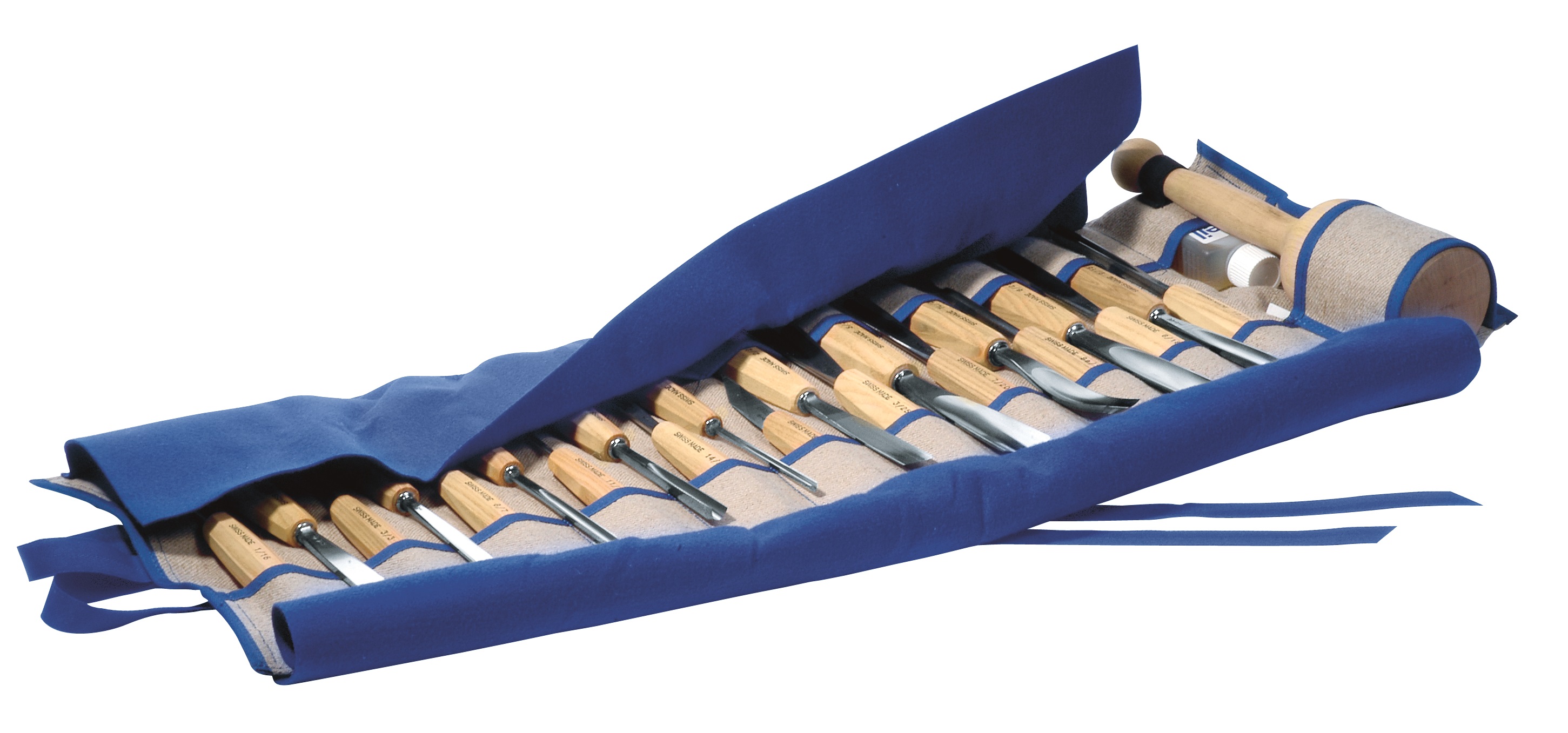 Sada obsahuje 20 ks řezbářských dlát + dřevěnou paličku Ø 80 + 2 ks arkansasů + olej + řezbářský nůž.